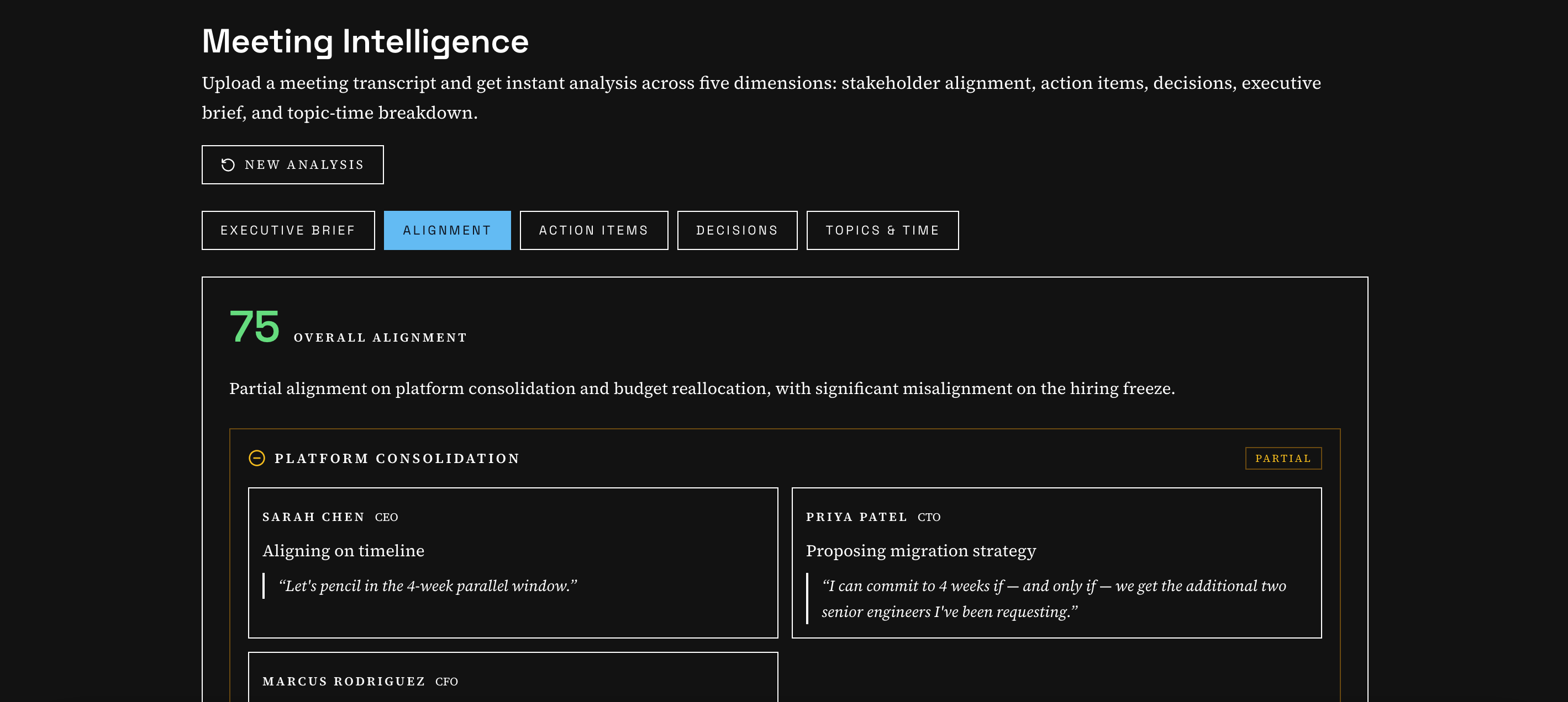 Upload a meeting transcript and get instant analysis across five dimensions: stakeholder alignment, action items, decision log, executive brief, and topic-time breakdown.